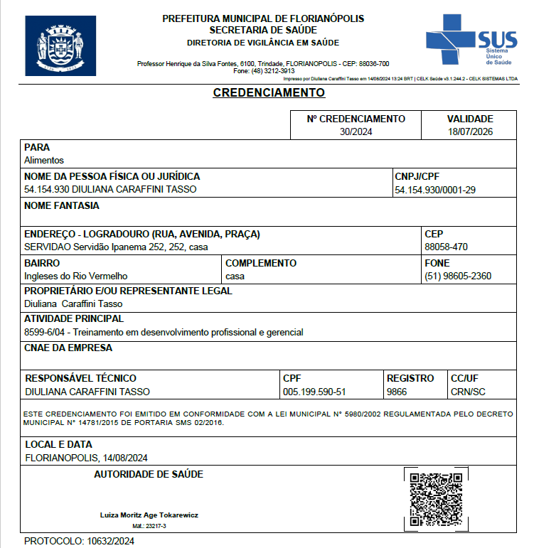 Credenciada na prefeitura e autorizada a dar o Curso de Boas Práticas de Manipulação de Alimentos e emitir certificado com validade de 2 anos
